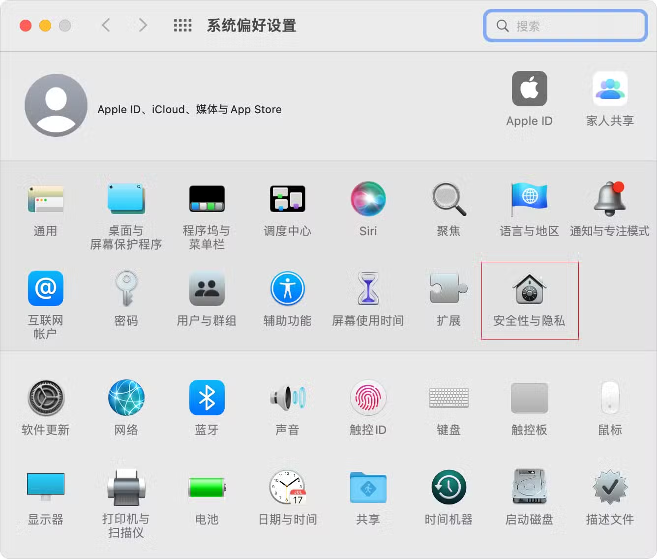 然后打开“系统偏好设置” -> “安全性与隐私”