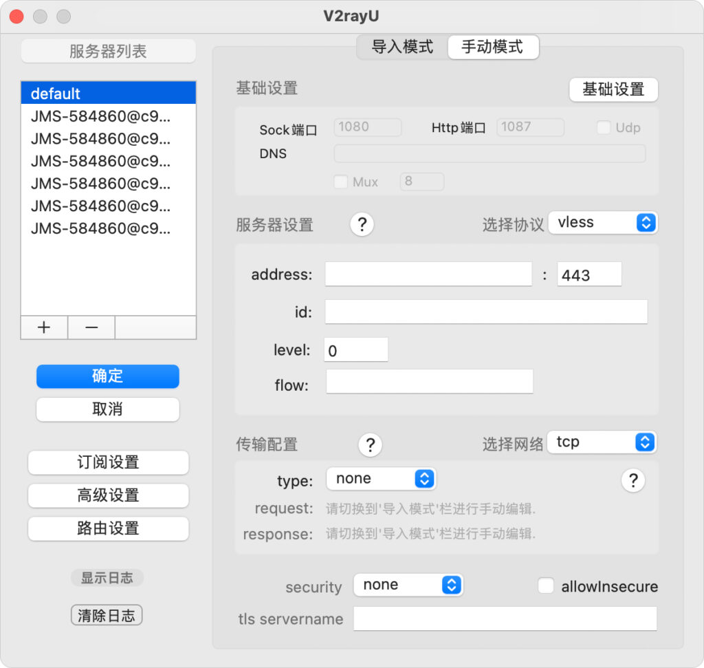 打开主菜单 -> 服务器设置,点击服务器列表处的 ➕ 添加服务器,然后选择手动模式,在选择协议选择 vless 即 Xray 协议,如下图