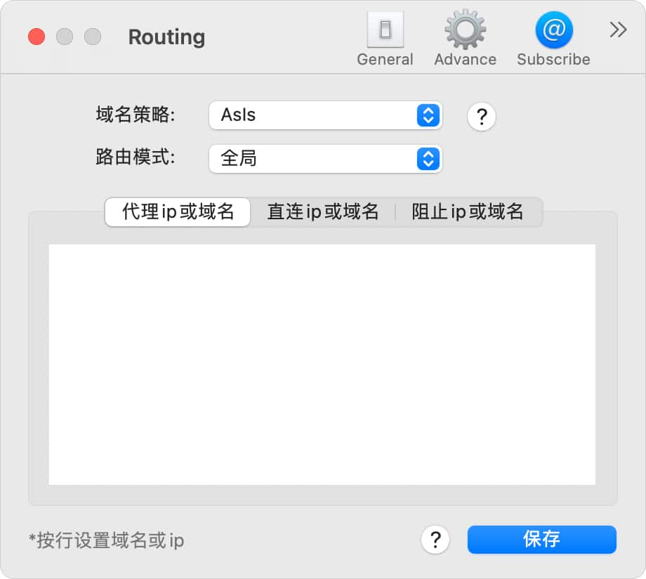打开主菜单 -> 服务器设置,点击路由设置,在这里可以配置域名策略及路由模式,已经需要代理IP或域名、需要直连IP或域名、需要阻止IP或域名,如下图所示新用户直接默认即可。